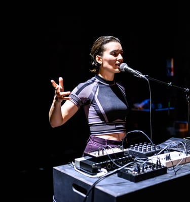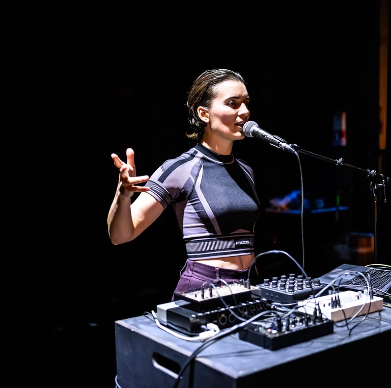 ·es questionne ce qu’est être une femme et le cadre qu’on lui attribue. Le stéréotype de genre créé par notre société s’infiltre jusqu’à l’intime et l’empêchement revêt de multiples aspects. Une recherche autour du corps, du souffle, de la voix se tisse avec celle de la musique électronique.